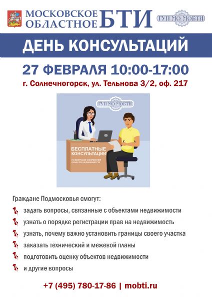 27 февраля в офисе Солнечногорского филиала Московского областного БТИ по адресу: МО, г. Солнечногорск, ул. Тельнова д. 3/2, оф.217 пройдет Консультационный день.